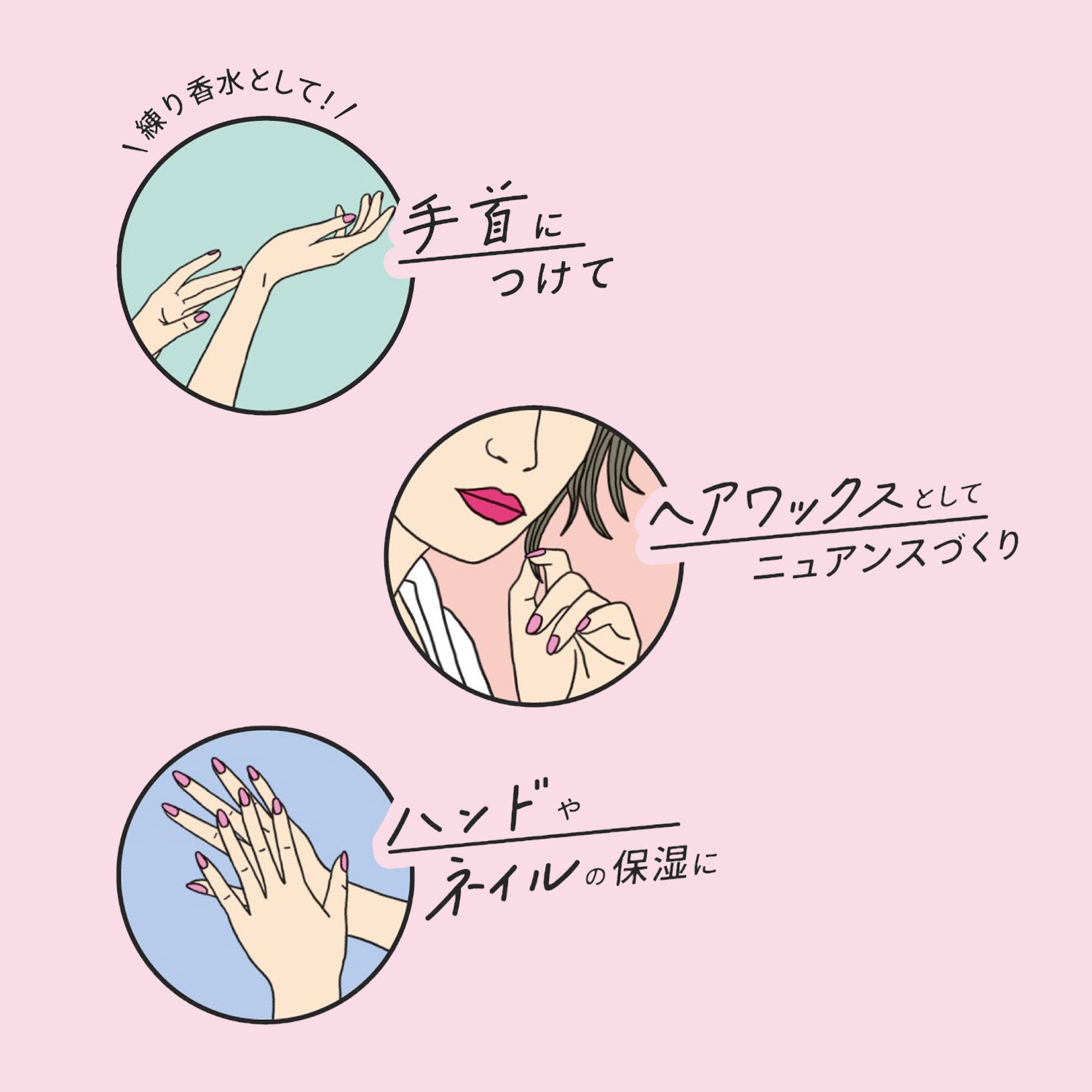 手首や首すじに適量つけて香りを楽しめます。髪や指先のケアとしてもお使いいただけます。
